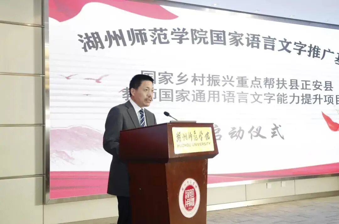 湖州师范学院副校长舒志定为本次启动仪式致辞。他强调,语言文字是文化传承的载体,是国家繁荣发展的根基。这次承担国家乡村振兴重点帮扶县正安县教师国家通用语言文字能力提升项目,是学校深入贯彻、全面落实习近平总书记在全国脱贫攻坚总结表彰大会上的重要讲话精神和国家语言文字会议精神的重要体现。他指出,作为国家语言文字基地,着力为提升民族地区、经济欠发达地区教师国家通用语言文字能力水平,这是学校融入国家发展战略的主动作为和积极担当。举办正安县教师国家通用语言文字能力培训项目,是切合我校教师教育传统办学优势。他从加强立德树人铸师魂改革、“三位一体”招生改革、教师教育培养模式改革、教师教育协同育人机制改革、教师教育政策研究改革等方面介绍了我校近年来教师教育工作的发展情况。同时对如何提升培训质量提了三点意见:提高站位,以使命驱动工作责任;切准问题,以专业提升培训质量;增进信任,以合作赋能教育发展。