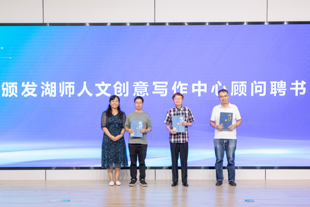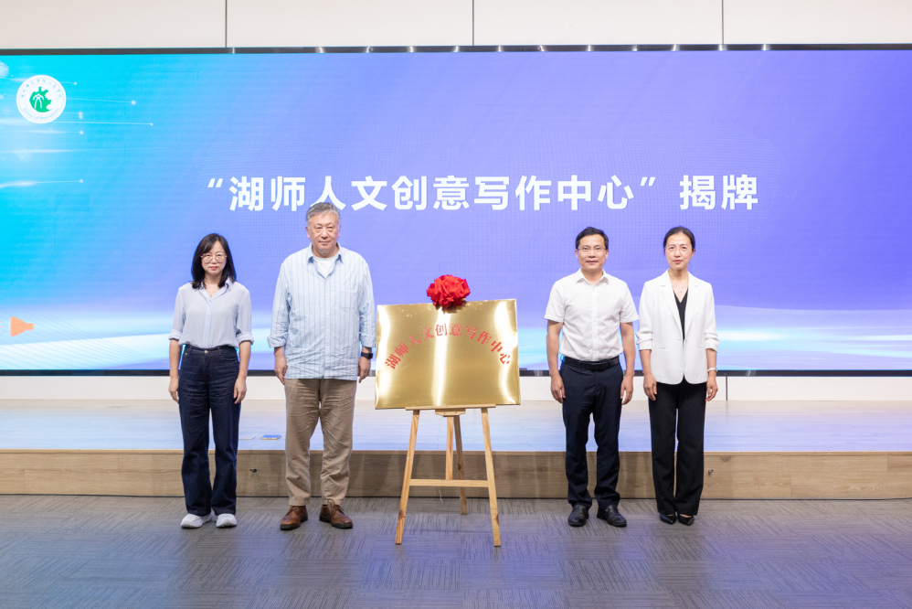 在热烈掌声中,孙甘露、楼建林、朱小芳、孙明霞共同为“湖师人文创意写作中心”揭牌,标志着这一平台正式启航。