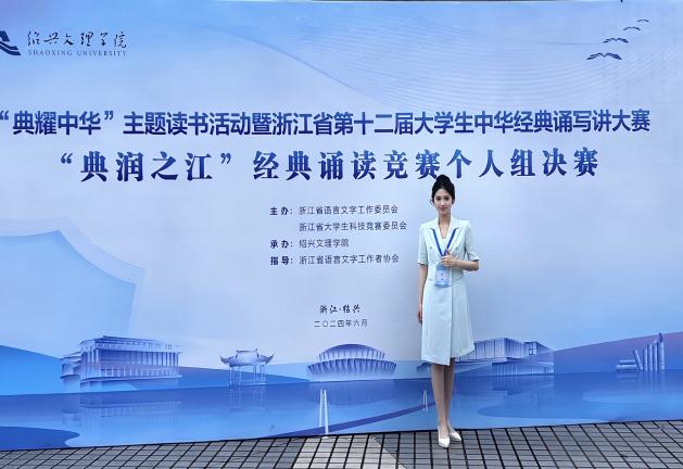 师范技能与知识积累离不开实践的磨砺。为使自身技能精进,她把学科竞赛作为“破茧成蝶”的舞台。大一下学期,初登竞赛舞台的她从经典诵读校赛突围至省初赛,却因经验不足止步于三等奖。大二下学期,在施伟伟、杜瑞华两位老师的悉心指导下,她在一个多月内同时准备浙江省第十二届大学生经典诵读和诗词讲解两项省级A类学科竞赛。从学院选拔、校赛复赛到省赛现场,她分秒必争:白天研磨诗词格律,夜晚推敲朗诵技巧。这份昼夜不辍的耕耘终获回响,经典诵读与诗词讲解竞赛分获省一、二等奖。