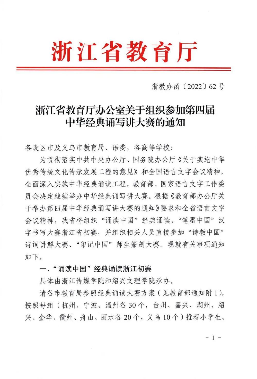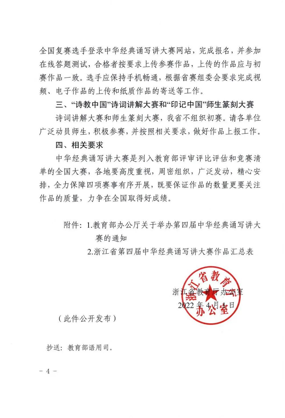 浙江省教育厅办公室关于组织参加第四届中华经典诵写讲大赛的通知