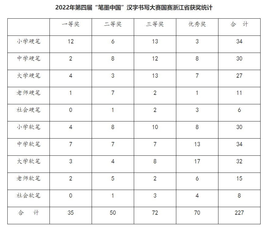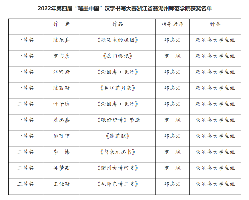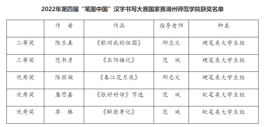 2022年第四届“笔墨中国”汉字书写大赛成绩公布,我校选送10幅作品参加省教育厅和省语委组织的省赛中全部获奖,其中一等奖6项,二等奖3项,三等奖1项。选送7幅作品参加教育部和国家语委的国赛中,5幅作品获得二等奖、三等奖和优秀奖。学校被浙江省语委评为浙江省2022年“笔墨中国”汉字书写大赛优秀组织奖。