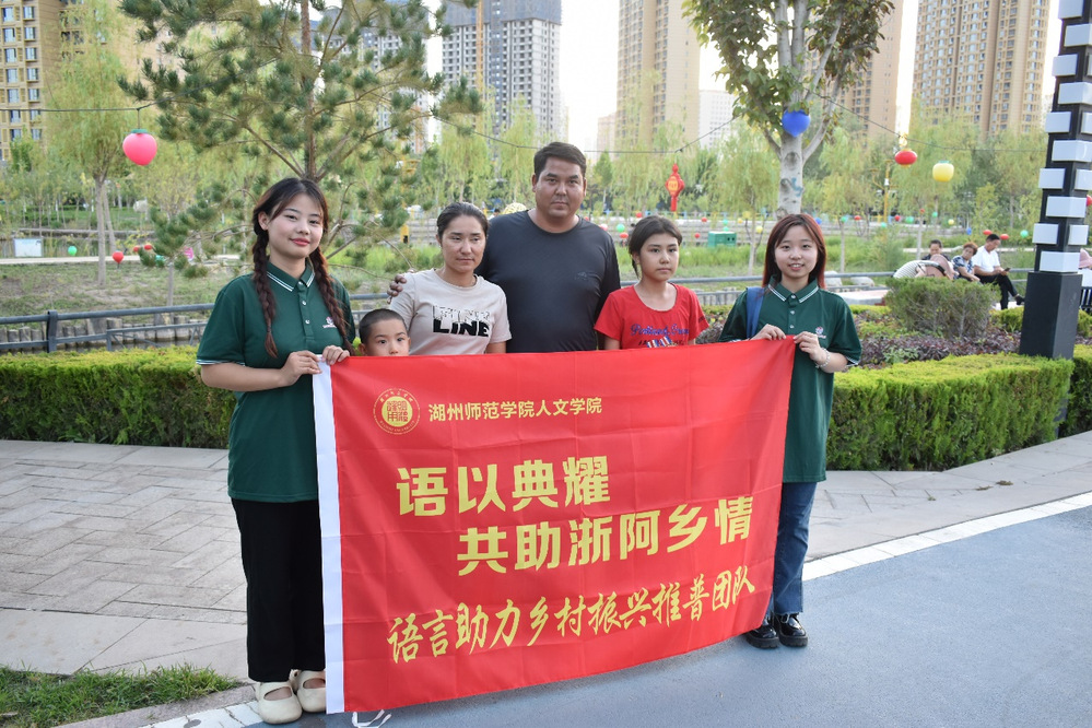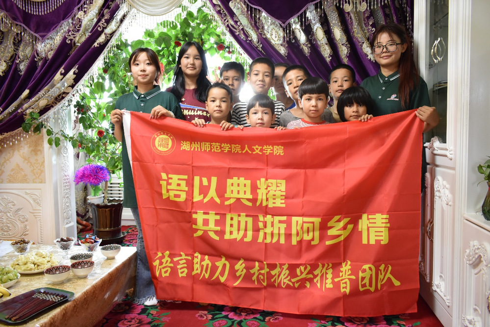 2023年7月至8月,来自湖州师范学院国家语言文字推广基地的“语以典耀,共助浙阿乡情”—— 语言助力乡村振兴推普团队远赴新疆阿克苏地区,开展推普助力乡村振兴活动。这支暑期实践团队以调查新疆民族地区普通话使用情况、促进浙江与阿克苏两地的文化交流和乡村振兴为目的,推普效果显著。