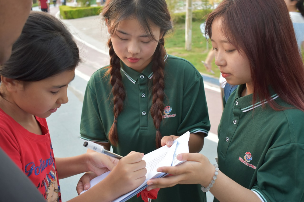 八月上旬,实践团队来到阿克苏实验中学,为少数民族高中生带来了一堂别开生面的普通话课程。在课堂中,团队成员带领学生一起诵读了经典诗篇《沁园春·雪》,在活泼的课堂氛围中,团队成员介绍了推广国家通用语言的重要性,并和少数民族学生交流了学习普通话的方法和心得。