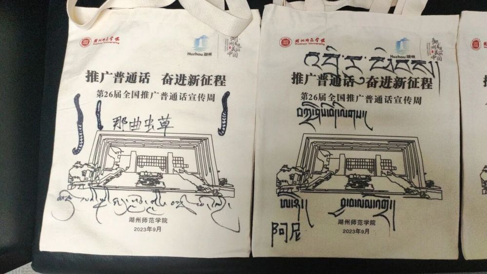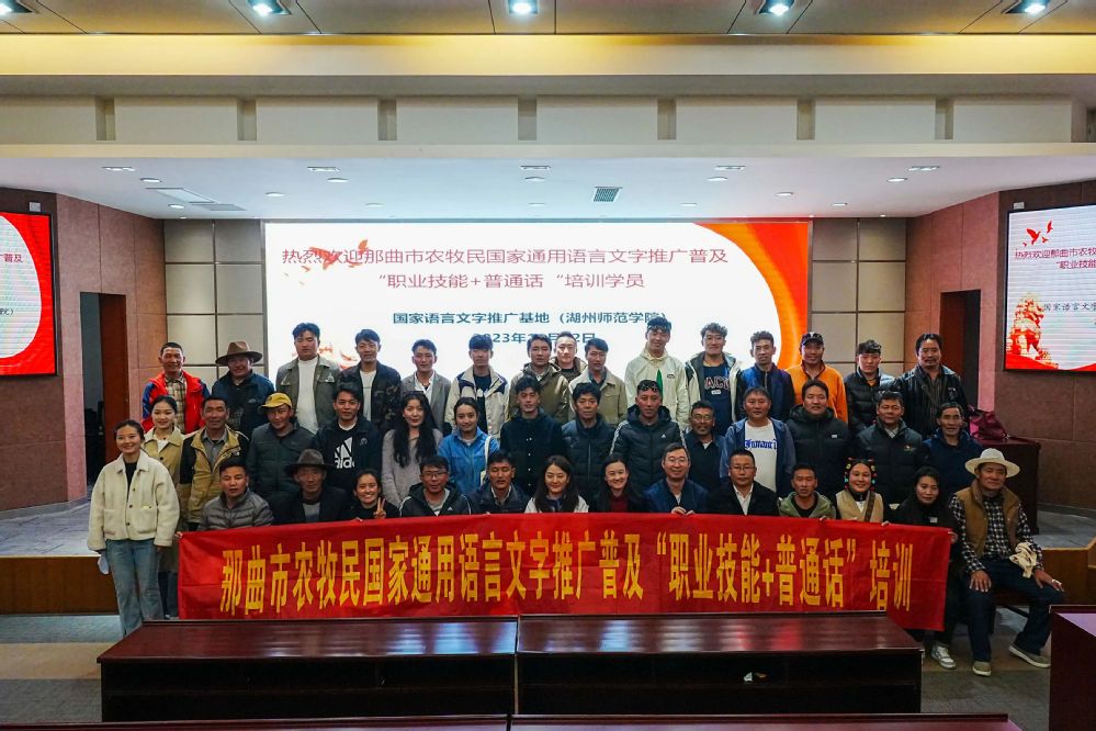 国家语言文字推广基地(湖州师范学院)、校语委办成员黄乐以“发挥基地优势,助力乡村振兴”为主题,为那曲学员介绍了我校大学生利用暑期到新疆阿克苏、西藏那曲等少数民族地区开展语言文字助力乡村振兴的相关活动,并介绍了浙江省部分乡村将语言文字工作纳入乡村治理体系的案例。讲座结束后,那曲市学员用藏文写下了“扎西德勒”“推广普通话,推进新征程”“湖州-那曲一家亲”等祝福语,并参观了吴兴园、长兴广场等地。