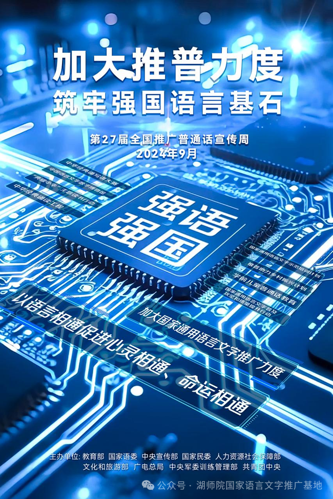海报二(静态、动态):以蓝色为基调,融合“芯片”等科技元素,体现数智技术在“加大国家通用语言文字推广力度”中的赋能作用。动态海报中,“强语强国”呈现“活字叠出”的形态,涌动的电流象征语言文字联通世界的功能与奔腾活力,凸显灿烂的语言文化之光点亮历史,照亮未来。