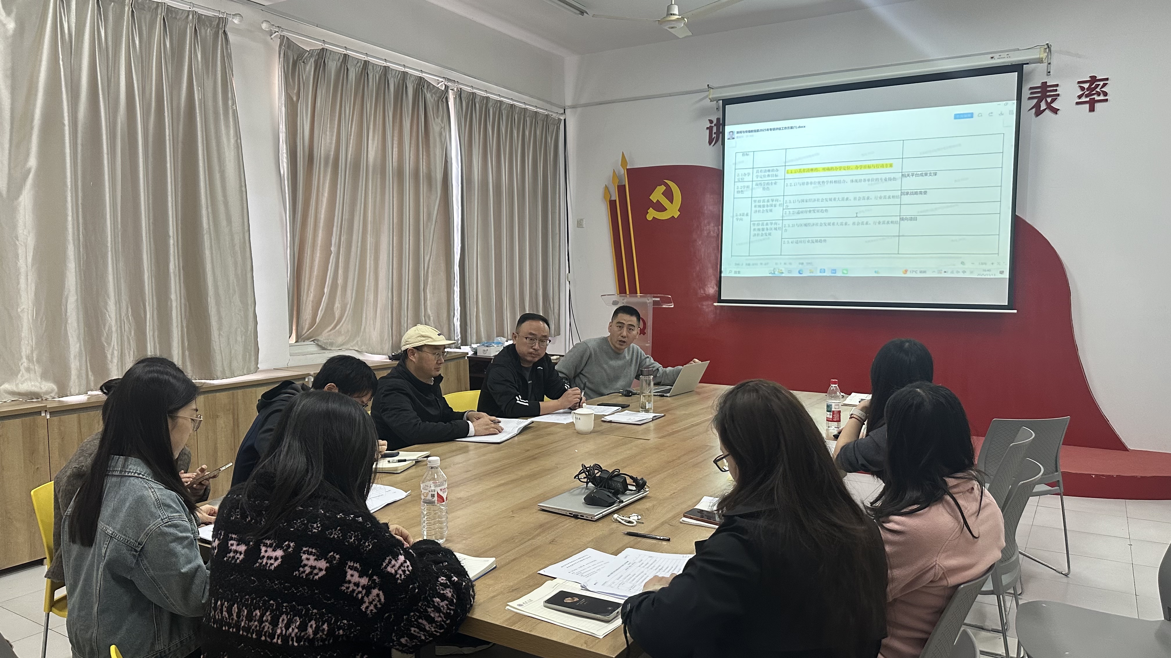 会议伊始,工作组成员一起详细解读了《新闻与传播教指委2025年专项评估工作方案》,明确本次评估的范围、程序、核心指标及时间节点,以及评估对硕士点建设质量提升、专业发展定位优化的重要意义。随后,会议按照评估指标体系分模块推进,各模块负责人依次汇报佐证材料收集进度,重点梳理了课程教学、师资队伍、培养过程、学位论文、实践基地等核心板块的材料筹备情况,并结合评估标准,坦诚交流了材料整理中遇到的难点问题,如部分历史档案补充完善、实践成果量化统计、特色亮点提炼等。与会人员围绕相关问题展开热烈研讨,共同商议解决方案,明确了材料补充的具体路径和责任分工。