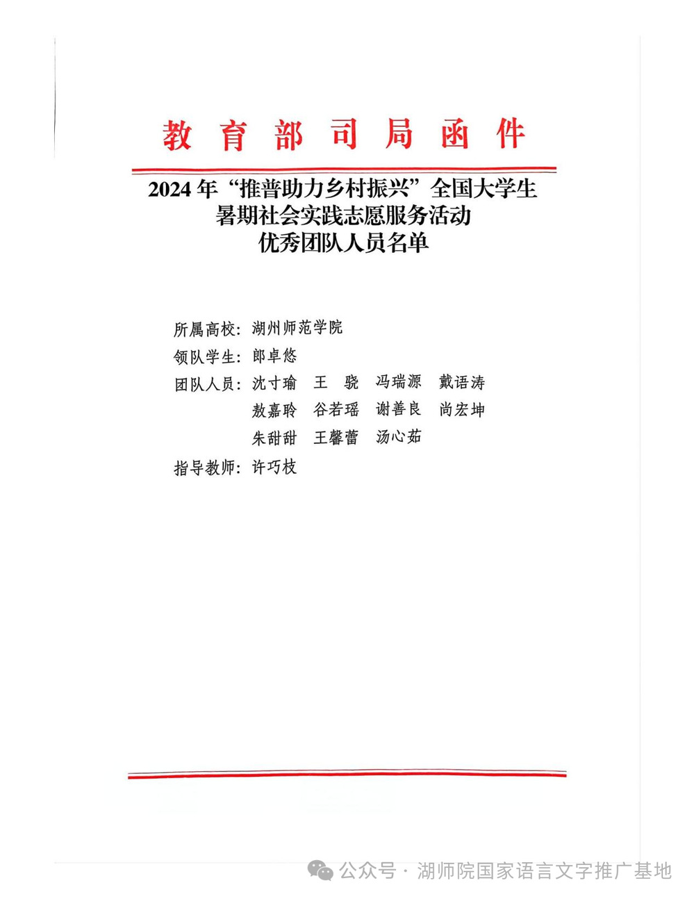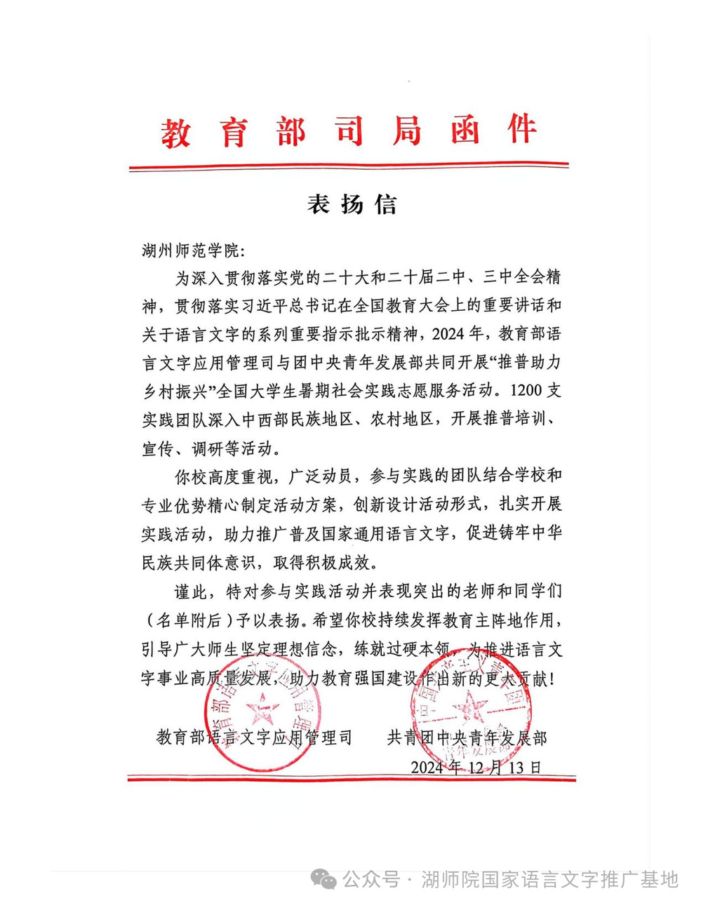为深入学习贯彻落实党的二十大精神,加大国家通用语言文字推广力度,国家语言文字工作委员会于2024年暑期开展了“推普助力乡村振兴”全国大学生暑期社会实践志愿服务活动。全国共计有6998支团队共计7万余师生报名参加,经教育部语言文字应用管理司组织评审,最终确定1200支团队入选,国家语言文字推广基地(湖州师范学院)选派的大学生志愿者服务团队中有两支通过了遴选。团队赴青海海西藏族自治州格尔木市等地开展活动,实践成效斐然。实践活动结束后,教育部评选出240支优秀团队。我校人文学院“浙青联动——湖州师范学院推普助力乡村振兴实践团”团队获教育部表彰。