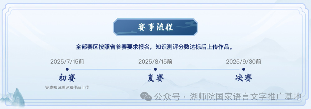 其他省(区、市)的参赛者登录大赛官网自主报名参赛。参赛者按照参赛指引自行完成语言文字知识及书法常识测评。60分以上为测评合格,合格者方可在大赛官网提交参赛作品图片与书写视频,提交时间截至5月31日24:00。