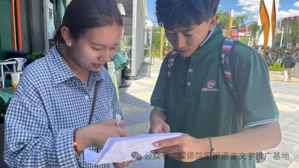 次日,团队深入纳金社区,以故事讲述串联民族记忆,用标语领读凝聚发展共识。居民们在填写问卷时主动请教发音细节,原本陌生的隔阂在一句句“您好”“谢谢”中消融, 杂货店的老板娘笑眯眯地说:“近年来来我们拉萨旅游的人很多,学好普通话真的很重要!”