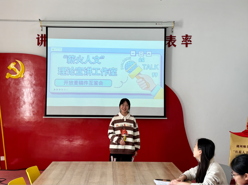 2025年12月5日,开放麦稿件互鉴会在13幢305室举行,本次活动由“思享家”辅导员工作室、“薪火人文”理论宣讲工作室主办,旨在打磨宣讲内容,为后续深入社区宣讲奠定扎实基础。人文学院党委副书记谭珊、辅导员吴安迪及多位优秀大学生宣讲员共同参与活动。