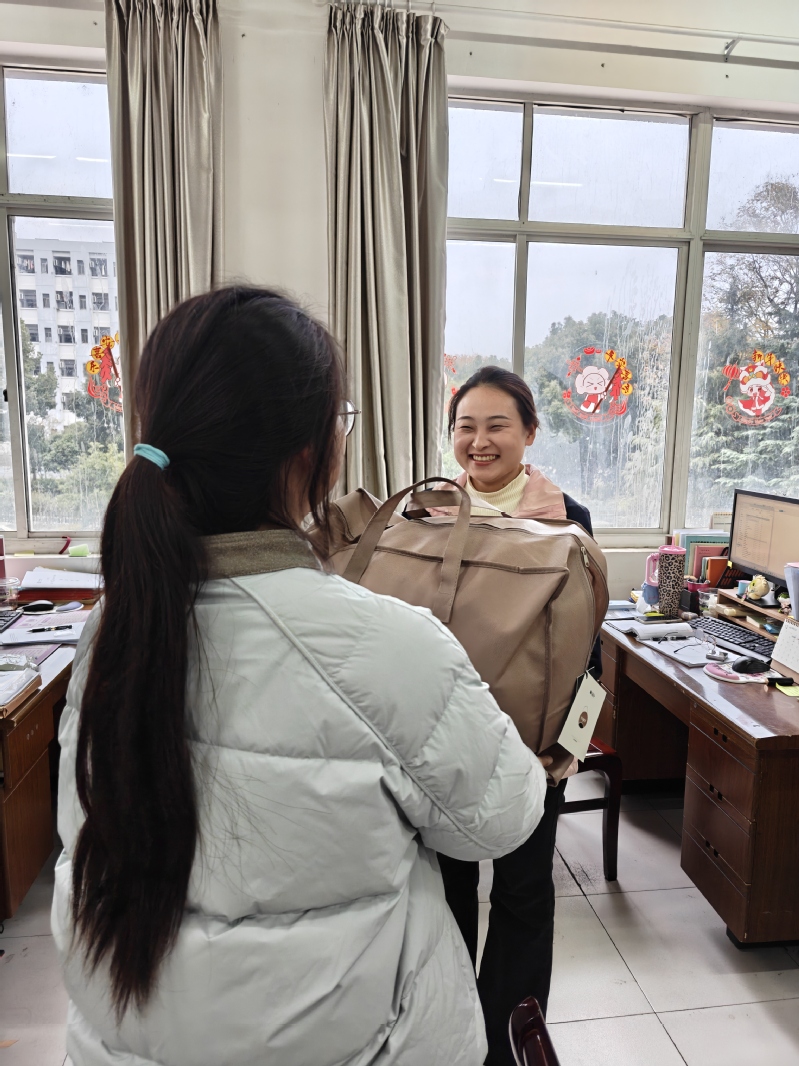 本次活动形式多样,涵盖寝室走访、师生交流与物资发放等环节。学院党委副书记谭珊带领辅导员深入学生宿舍,与同学们亲切交谈,细致了解大家的学业进展与生活状况。谭珊鼓励同学们认真备考,在期末考试中力争佳绩,同时希望大家保持真诚质朴的品格,积极自信、乐观向上。