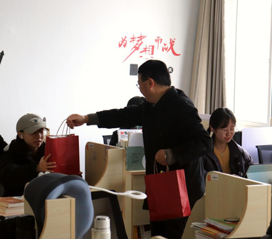 在学院考研教室,学院领导为同学们发放了精心准备的慰问品。学院院长潘明福叮嘱大家要合理安排时间,注重劳逸结合,提高复习效率,鼓励大家要坚定信心、调整心态,以饱满的精神状态迎接考试。党委书记程龙向即将踏上考研考场的同学们致以亲切的问候和美好的祝愿,着重强调要严守诚信考试底线,切勿触碰作弊等违纪违规行为的红线。