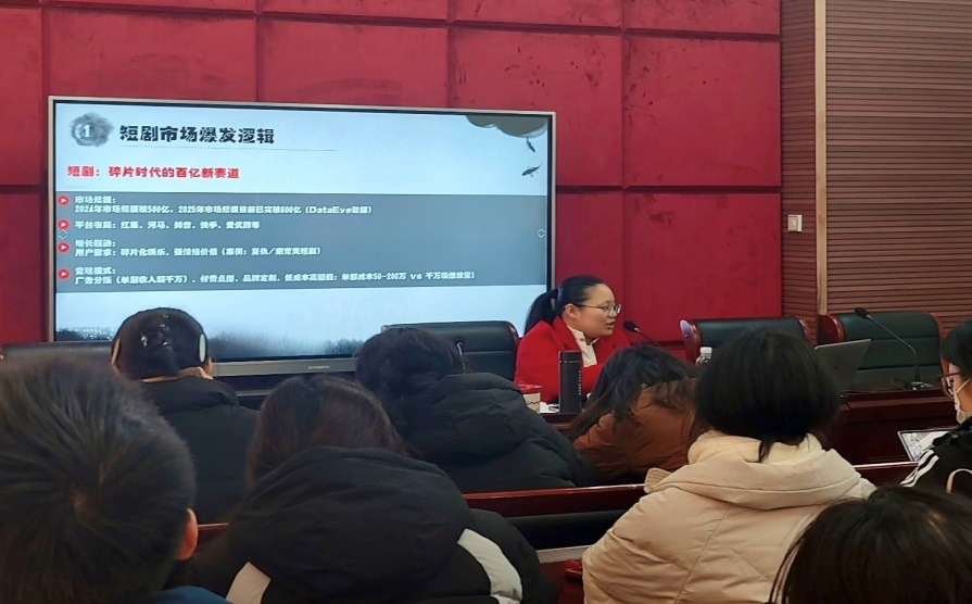 1月7日下午,浙江熠煊影视传媒科技有限公司总经理、浙江省作协会员、浙江省网络作协会员孙晓婷女士做客人文学院学术讲坛,以“网络文学IP价值挖掘与转化”为主题,为人文学院学生们解析短剧动漫改编市场开发。